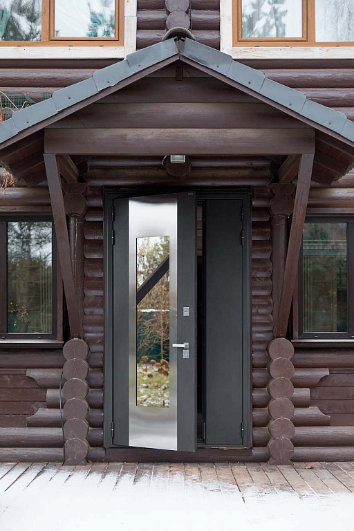 Дверь TERMAX Lumi 200 идеально подошла под проект дома-шале. Снаружи дверь совпала по оттенкам с внешней отделкой дома, а внутренняя панель двери из белого МДФ прекрасно вписалась в новый светлый интерьер.